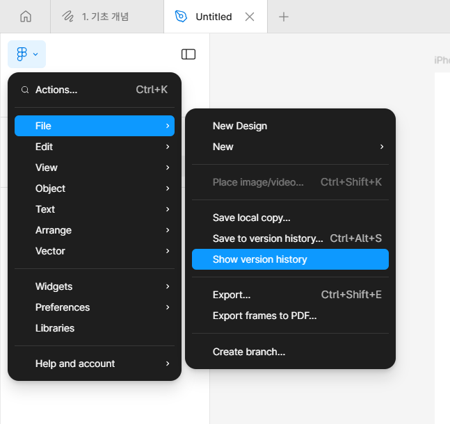 화면 왼쪽 상단의 Figma 로고 > File 을 통해 버전별로 저장 가능하고 저장해둔 버전을 볼 수도 있다.