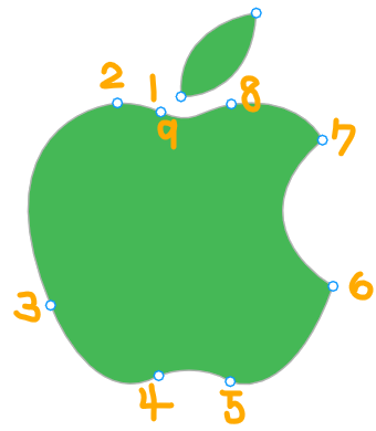1) 잎사귀를 그려준다 2) 1~9 순서대로 점을 찍어서 선을 따라 그려준다. **가장 위아래의 파인 부분에 점을 찍으면 본래의 애플 로고처럼 매끄러운 곡선이 아닌 뾰족한 지점이 생기게 된다. 따라서, 파인 부분의 옆에 점을 찍어서 곡선을 그리는 것이 매끈한 곡선을 만들기에 수월하다. |