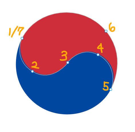 1) 1~7 순서대로 점을 찍어서 윗 부분 선을 따라 그려준다. 2) 그린 선을 클릭 후 alt + 선 드래그 하여 복제한다. 3) 복제한 선을 180도 회전시킨 후 태극 문양을 완성시킨다. 4) 맞지 않는 부분은 동그라미를 이동시키며 수정한다. 5) 우측 Design 탭의 Fill을 통해 색칠한다. |